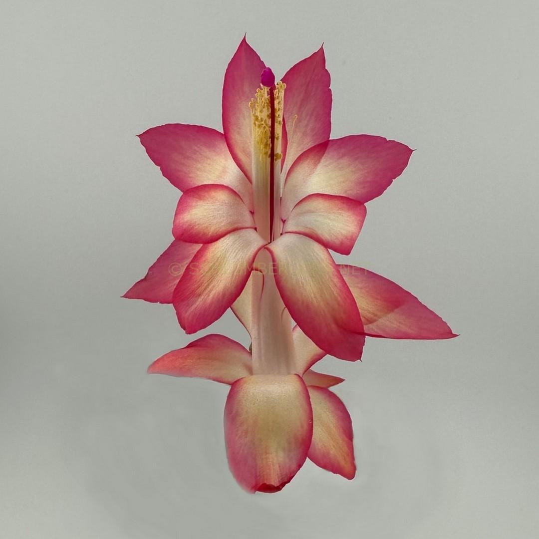 | color unknown | yes | medium-sized flower with cream throat and base of petals smoothly suffusing to soft rose-pink toward the mid-petal area, with deeper pink to carmine-red apices and margins. The petals apices are acutely pointed. The throat is white to pale cream. The floral tube is white. Deep pink to magenta stigma extends beyond yellow anther cluster. The ovary receptacle is olive green. |