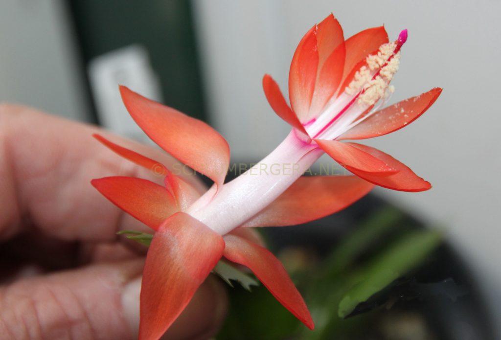 | narrow, sharply tipped petals have white bases, soft orange centers with upper centers and margins a bright, rich orange. Basal petals recurve strongly. Tube is white and long. A magenta-pink stigma extends well beyond the anthers. |