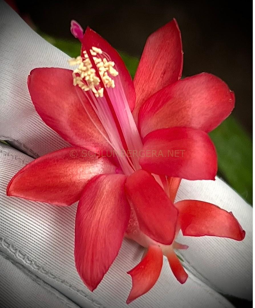 | pink | yes | small carmine-red flowers with white to light pink petal bases and throats. The unusually shaped buds are a delicate pink. Petal tips of mature flowers are pointed. The flowers resemble the pollen parent ‘Happy’, particularly in the atypical bud shape and overall floral form. The purple stigma extends beyond yellow anthers cluster. The ovary receptacle is light green. |