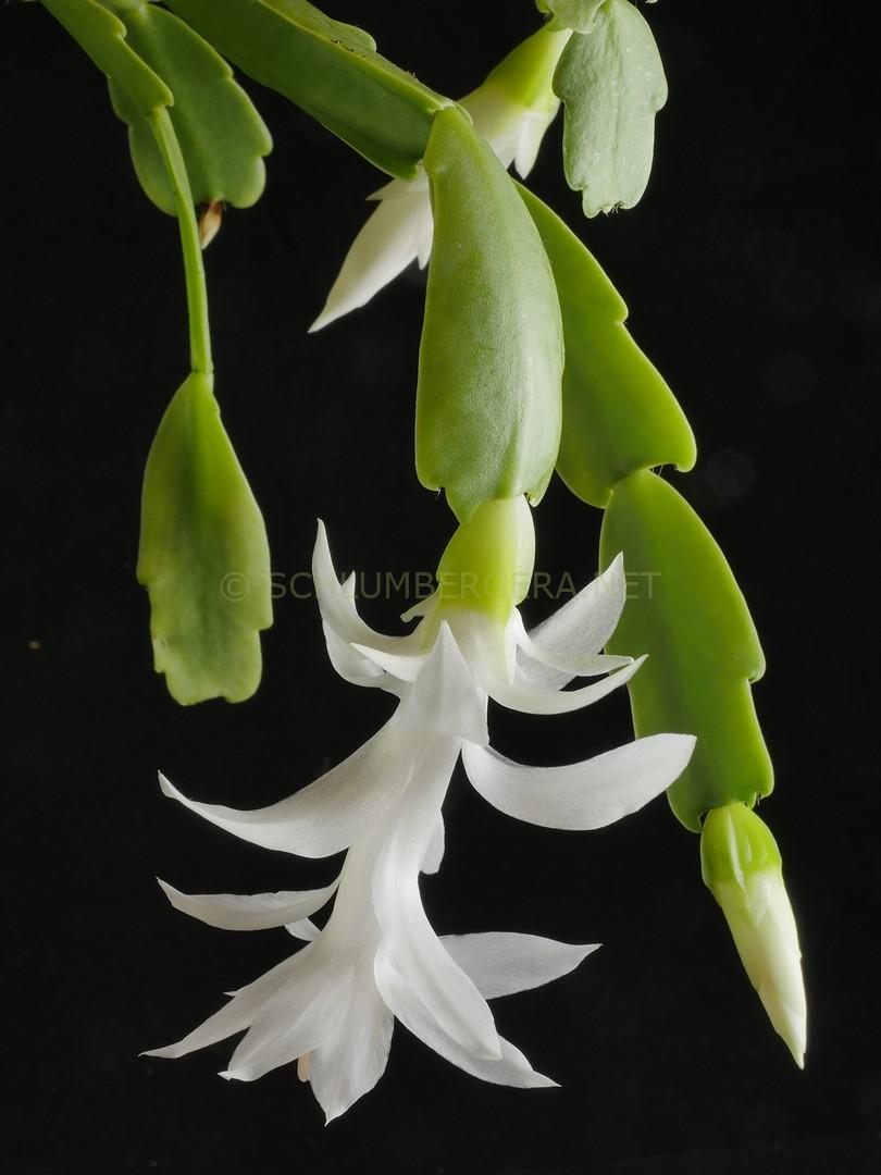 | white | yes | medium-sized pure white albino flowers, strongly pendant and gracefully elongated. Petals are narrow, slightly recurved, and arranged in multiple whorls, giving the bloom a finely layered, almost feathery appearance. Petal tips are sharply pointed and slightly reflexed downward. The floral tube is white. Anthers are pale cream, forming a compact column. The stigma is white and extends modestly beyond the anthers. The ovary receptacle is olive green. |